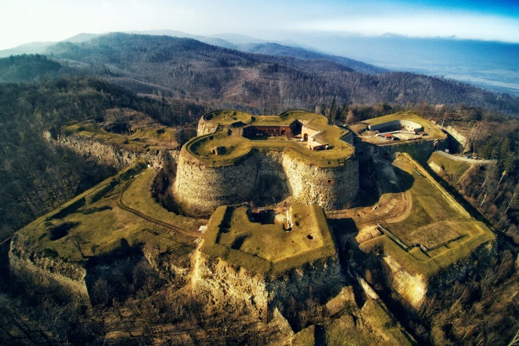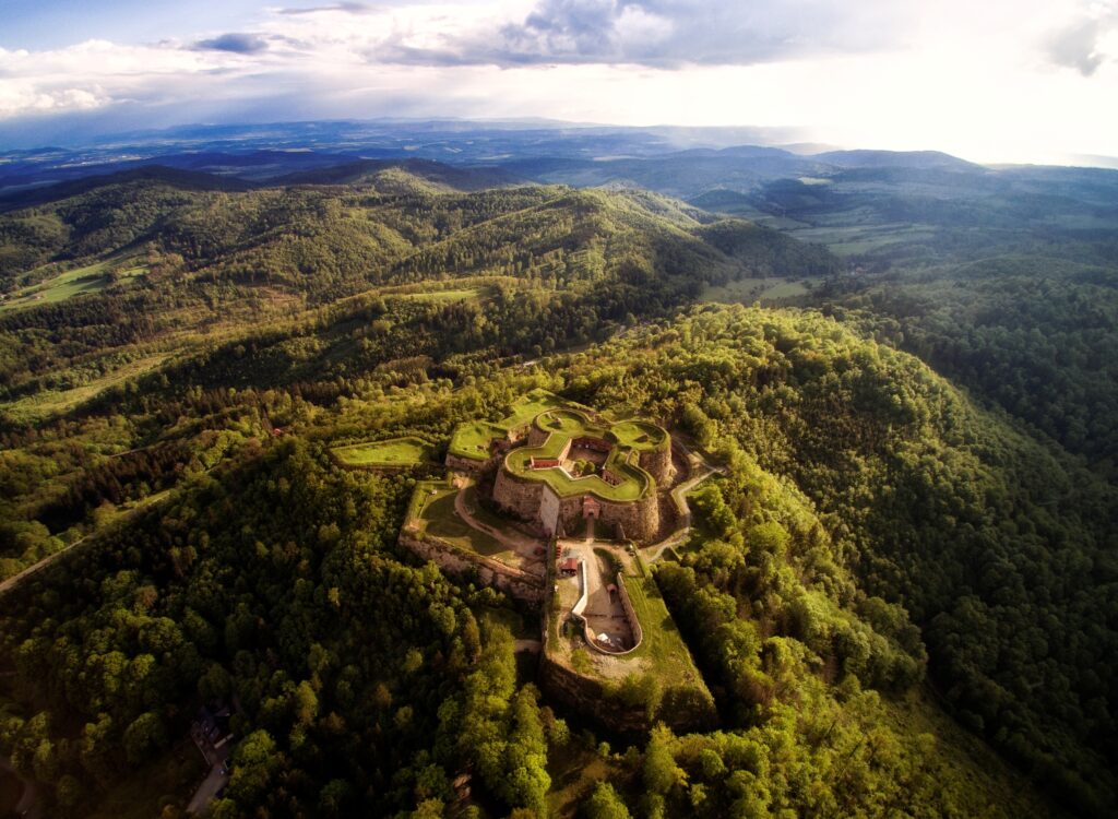 The Srebrna Góra Fortress (Twierdza Srebrna Góra) is located in Lower Silesia, Poland, and rises to a height of approximately 686 metres above the town of Srebrna Góra. Its strategic location on a ridge between Prussia and Austria determined its function as a border fortress and shaped its entire architectural development. The exposed location not only made construction difficult, but also offered excellent opportunities for monitoring and defending the surrounding area.